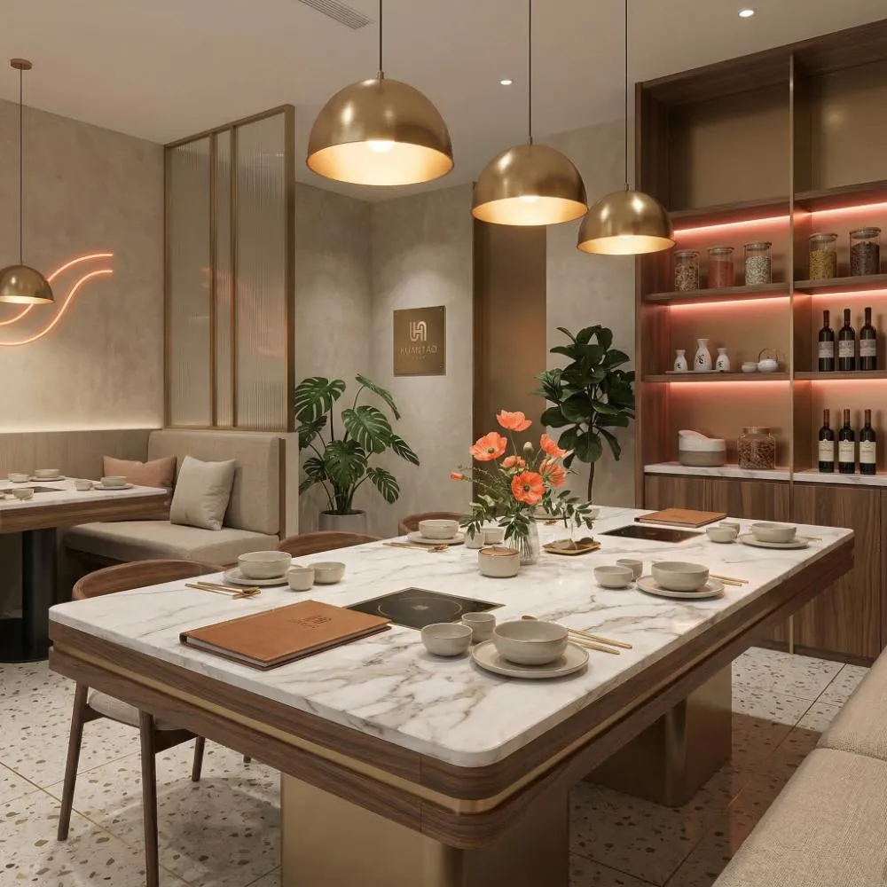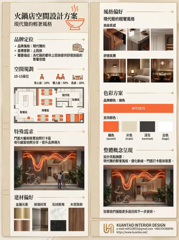 「我跟客戶討論風格設定為都市上班族會喜歡的——現代簡約輕奢風。你看這些圖,皮革軟包沙發、大理石桌面、暖光打下來,整體是有溫度的高級感,不是冷冰冰的那種現代。氛圍圖選的是暖棕+米白的組合,坐進去會覺得放鬆,又會提升火鍋價值感的設計。」