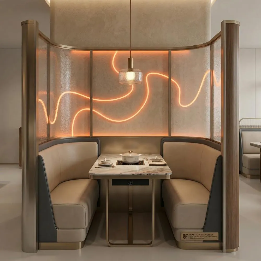 - 舒適氛圍參考:暖光包廂、圓桌設計、柔和色調