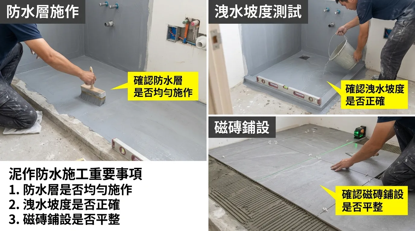- 洩水坡度:浴室地板需有1/100以上的洩水坡,避免積水