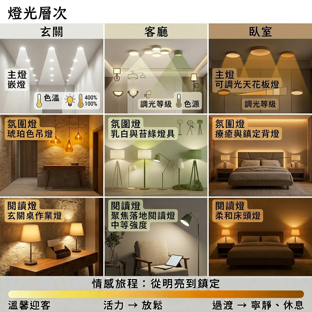 - 主燈 + 間接照明 + 情境燈,三層光源讓空間有表情